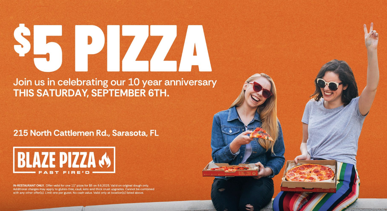 Blaze Pizza is celebrating 10 years serving the Sarasota community and firing up the fun in UTC with a grand re-opening event. Join us on Saturday, September 6 at the newly redesigned restaurant and enjoy: