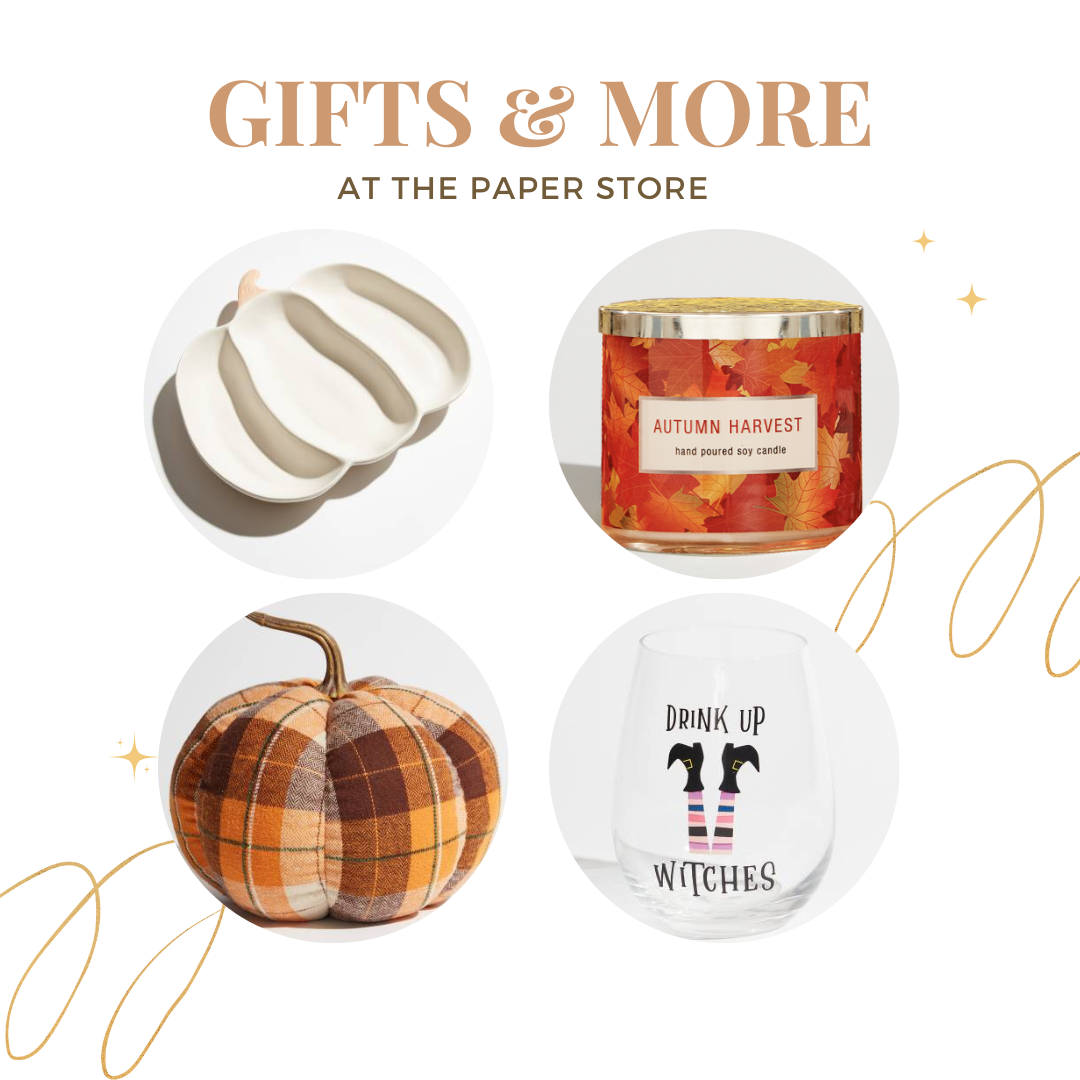 Trick-or-treat yourself to fresh fall fashions and decor deals at Gifts and More at The Paper Store. From pumpkin-shaped serving platters to seasonal sweaters, unique finds are always in season here.